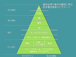 左図はハーバード大学公衆衛生大学院のウィレット教授が「何をどれだけ食べるべきか」分かるようにと発表した「地中海型食生活のピラミッド」です。