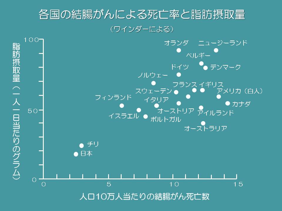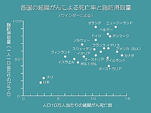 腸から少し話はそれますが、中でも非常に差があったのが、乳がんです。大腸がんに比べればまだ不明な点も多く、詳しい研究はこれからですが、乳がん大国のアメリカでは、乳がん予防の食事の研究に取り組む研究者も多く、動物性脂肪を控え、果物や食物繊維をとることの重要性がいわれています。
