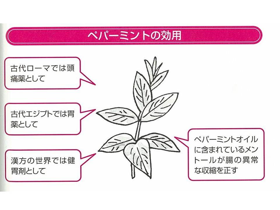 ペパーミントオイルに含まれるメントールには、腸の異常な収縮を正す作用があり、古代ローマでは頭痛薬として、古代エジプトでは胃薬として、漢方の世界では健胃剤としてもちいられてきました。