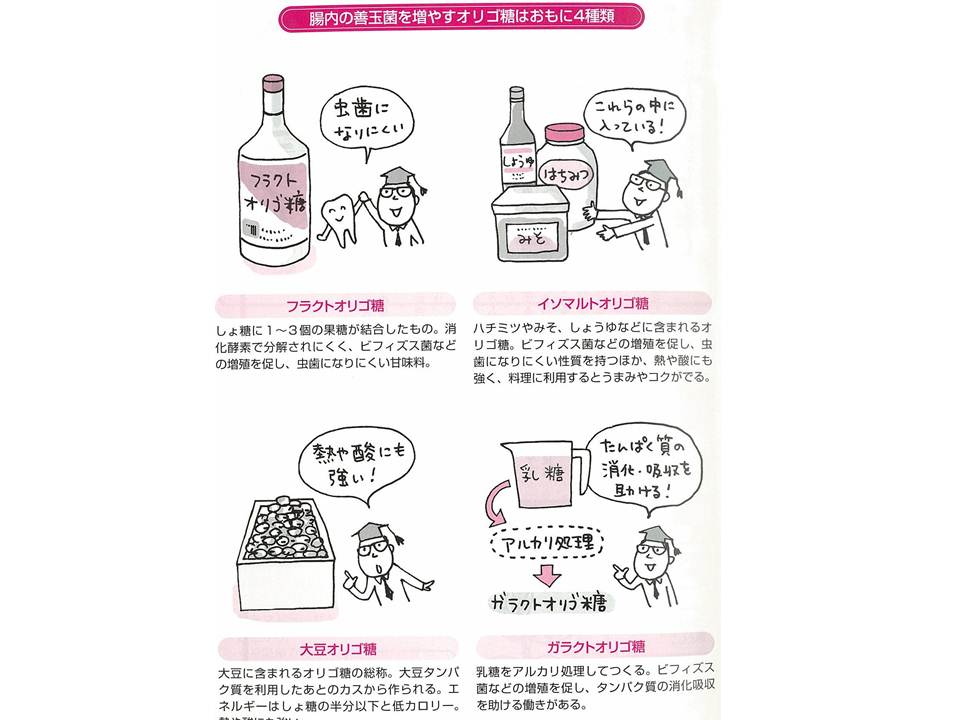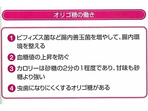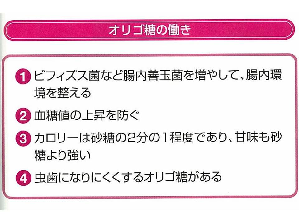 オリゴ糖には、虫歯になりにくいフラクトオリゴ糖、料理に利用するとうまみやコクがでるイソマルトオリゴ糖、熱や酸に強く低カロリーな大豆オリゴ糖、タンパク質の消化・吸収を助けるガラクトオリゴ糖など、おもに4種類があります。
